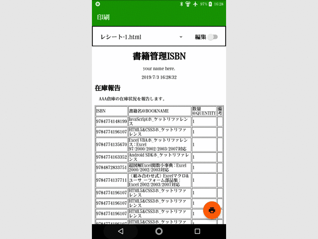 Androidアプリ Forme Pro(lite) Ver9.729から、フォームの印刷機能(AutoReport)が実装されました。 この機能は印刷用CSSを内包したHtmlファイルをテンプレートとし、フォームのレコードを任意の位置に転記して印刷する機能です。 メインメニューの設定シート共有のHtmlファイルをベースにテンプレートをコーディングすることが可能です。一部Javascriptが利用可能です。