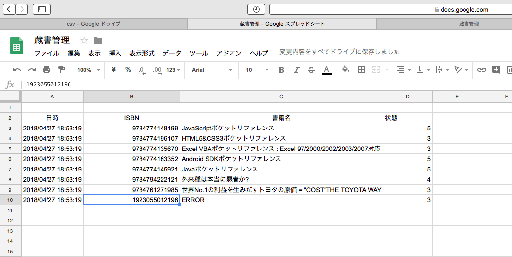 6.アーカイブに追加する。csvフォルダにcsvデータ”書籍管理.csv”が存在していると”書籍管理”スプレッドシートの一番目のシートに書き込みを行います。