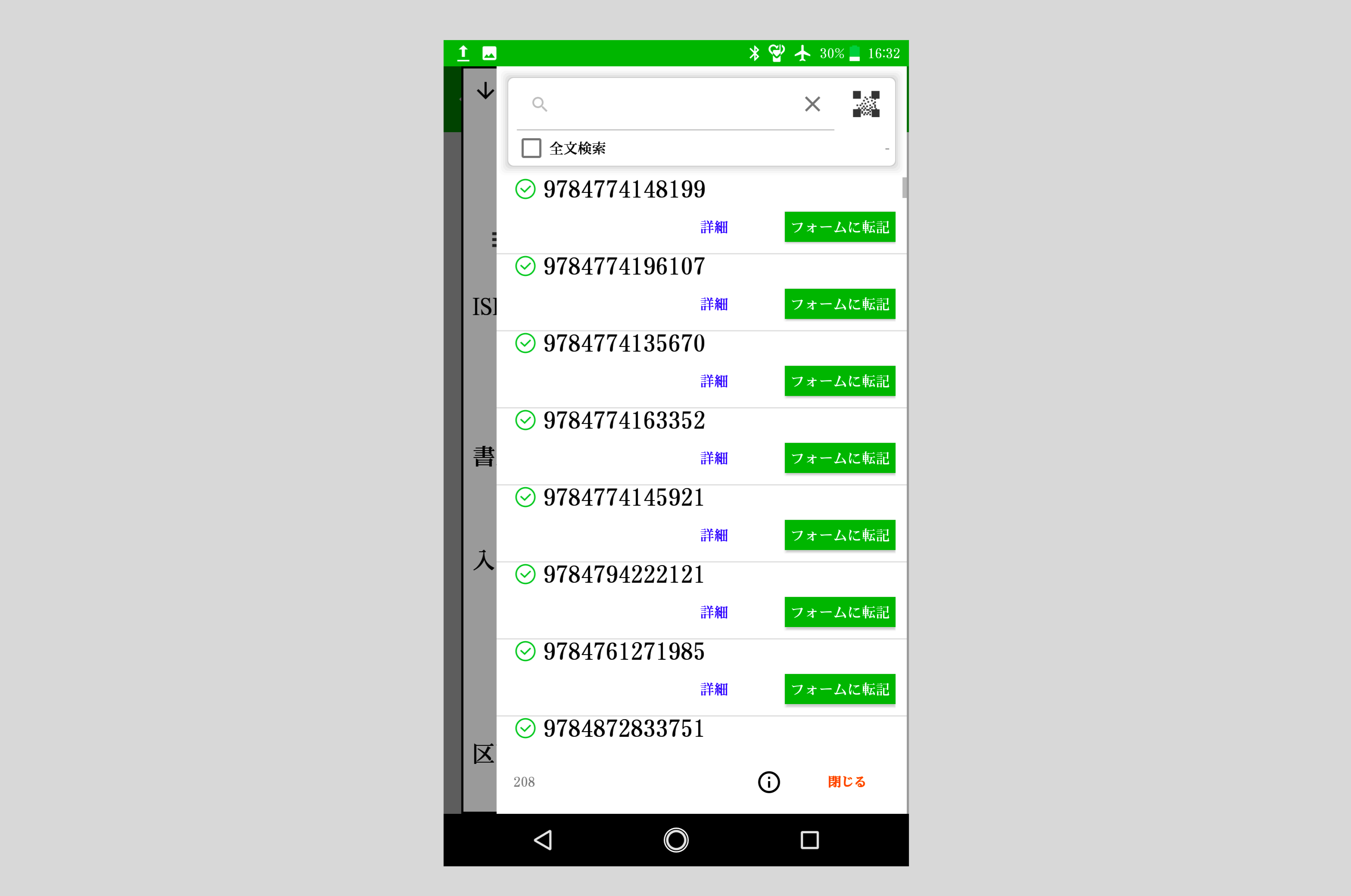 入力フォームのマスターデータをタッチすると、マスターデータパレットが表示されます。 全文検索をオンにするとマスターデータの全文から一致した候補が表示されます。通常はヘッダー列の検索を行います。