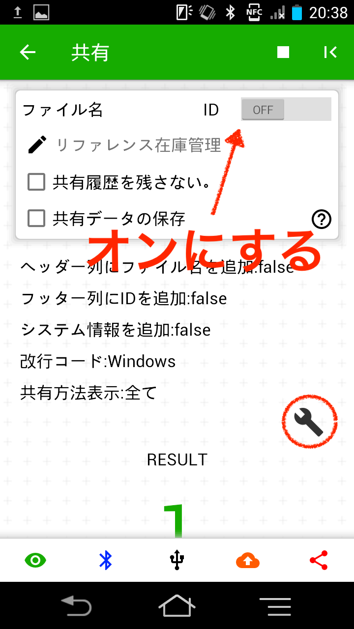 詳細設定では共有方法を一つだけ表示したり、共有アプリを登録することもできます。仮のデータを管理用パソコンへ送ります。