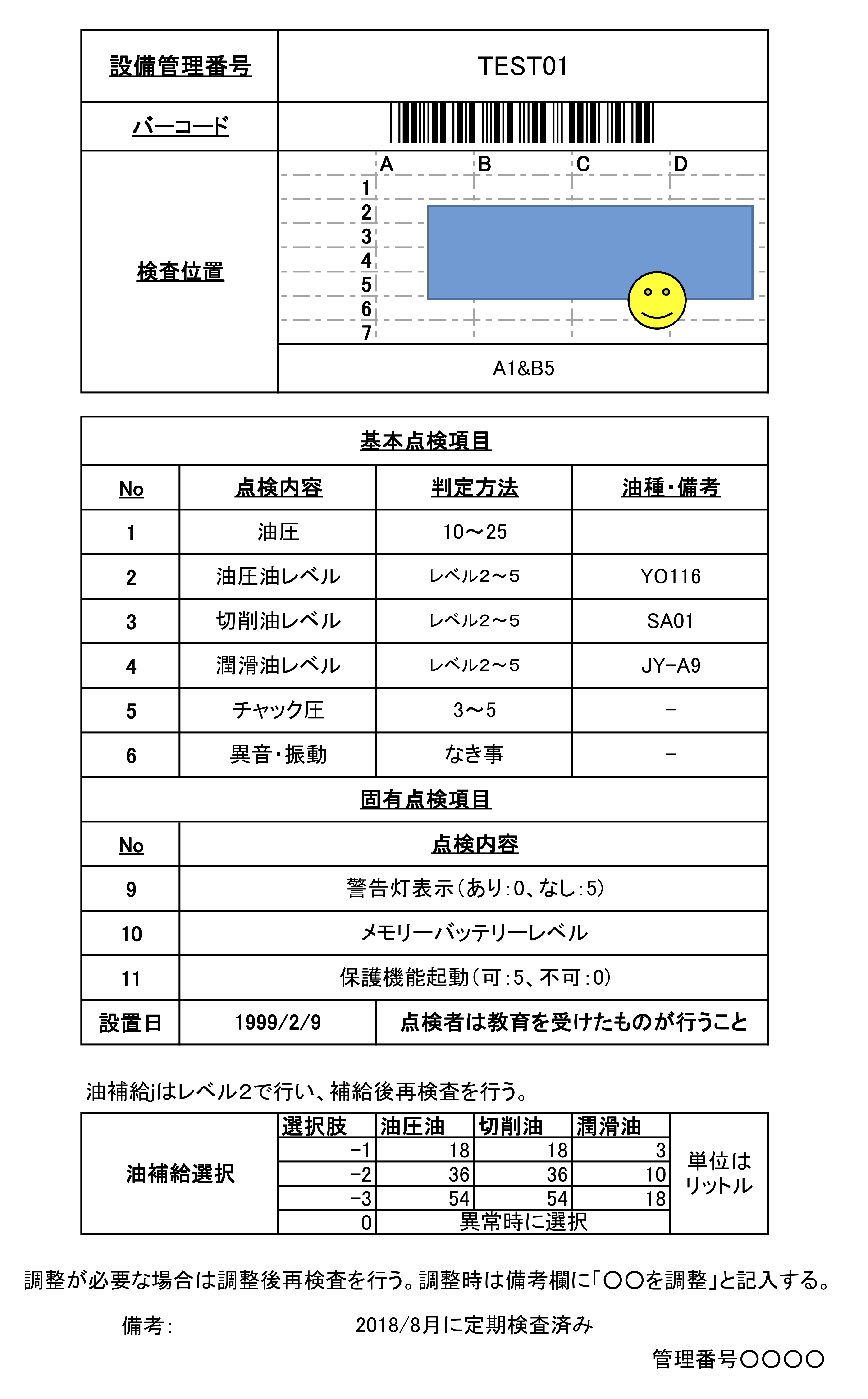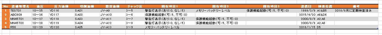 | 設備管理名 | 油圧 | 油圧油種 | 切削油種 | 潤滑油種 | チャック圧 | 固有項目1 | 固有項目2 | 固有項目3 | 設置日 | 検査位置 | 備考 |