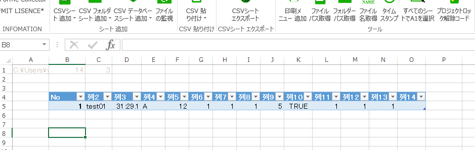 2.FormeCollector.xlsmの設定で選択したバックアップフォルダにあるCSVデータを選びます。 (ヘッダーが無く、軽量なものであればなんでも良いです。)新しくシートが挿入され、テーブルが展開されます。