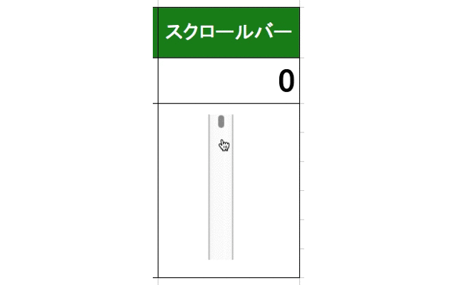 スクロールバーは参照先のセルに設定された数値(整数)内で数値をカウントアップ、カウントダウンした数値を書き込みます。 スピンボタンより、アバウトですが滑らかに変化できます。