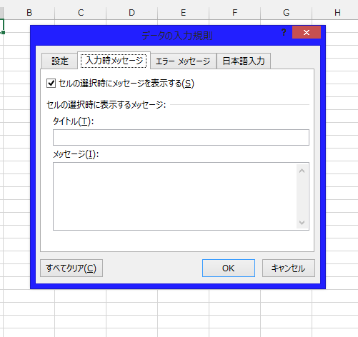 以下の画面で設定します。タイトルとメッセージを入力します。”セルの選択時にメッセージを表示する”をオフにすると、 メッセージは表示されません。何も入力されていなければ、表示されません。