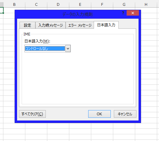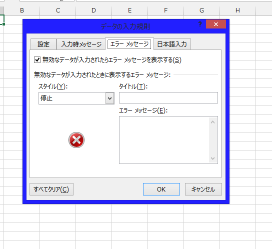タイトルとメッセージを入力します。”無効なデータが入力されたらエラーメッセージを表示する”をオフにすると、 メッセージは表示されません。