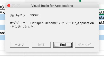 実行時エラー’1004’ オブジェクト’GetOpenFilename’メソッド’_Application’が失敗しました。