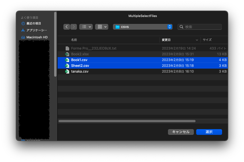 Mac版では使用可能ではありますが、ファイルタイプの指定も複数選択にも対応していません。因みにファイルタイプの指定ではエラーが発生し、複数選択は指定しても操作できない状態になっています。(Shift or Ctrl or command)