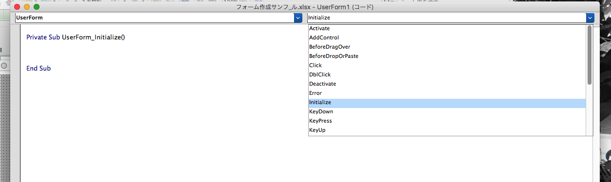 3.ファイル名 UserForm1(コード)ウィンドウ内で” Initialize “をを選択。(ユーザーフォームの初期化)