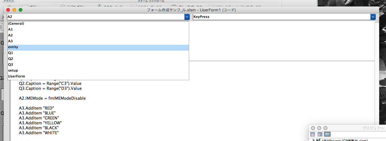 7.ファイル名 UserForm1(コード)ウィンドウ内で” entity “をを選択。