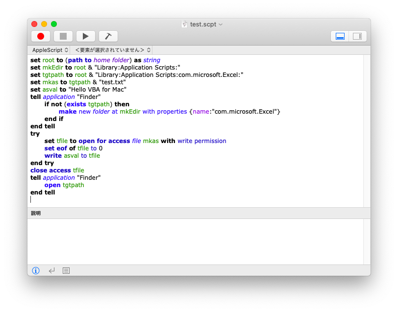 特定ディレクトリにテキストファイルを保存する AppleScript を VBA から出力する