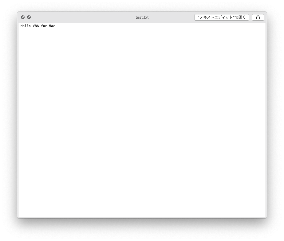 ” Hello VBA for Mac “ の内容の test.txt を特定のディレクトリに保存します。
