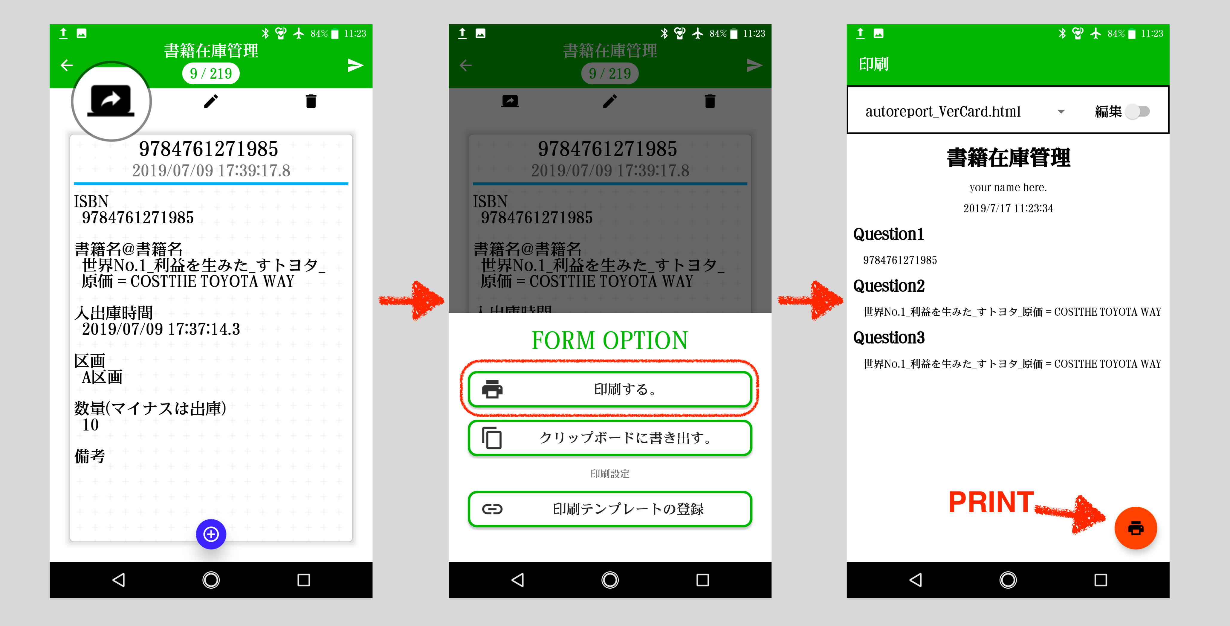 エクスポートをタッチし、FORM OPTIONを表示します。表示されたFORM OPTIONの印刷する。をタッチするとプレビューが表示されます。印刷ボタンで印刷が開始されます。