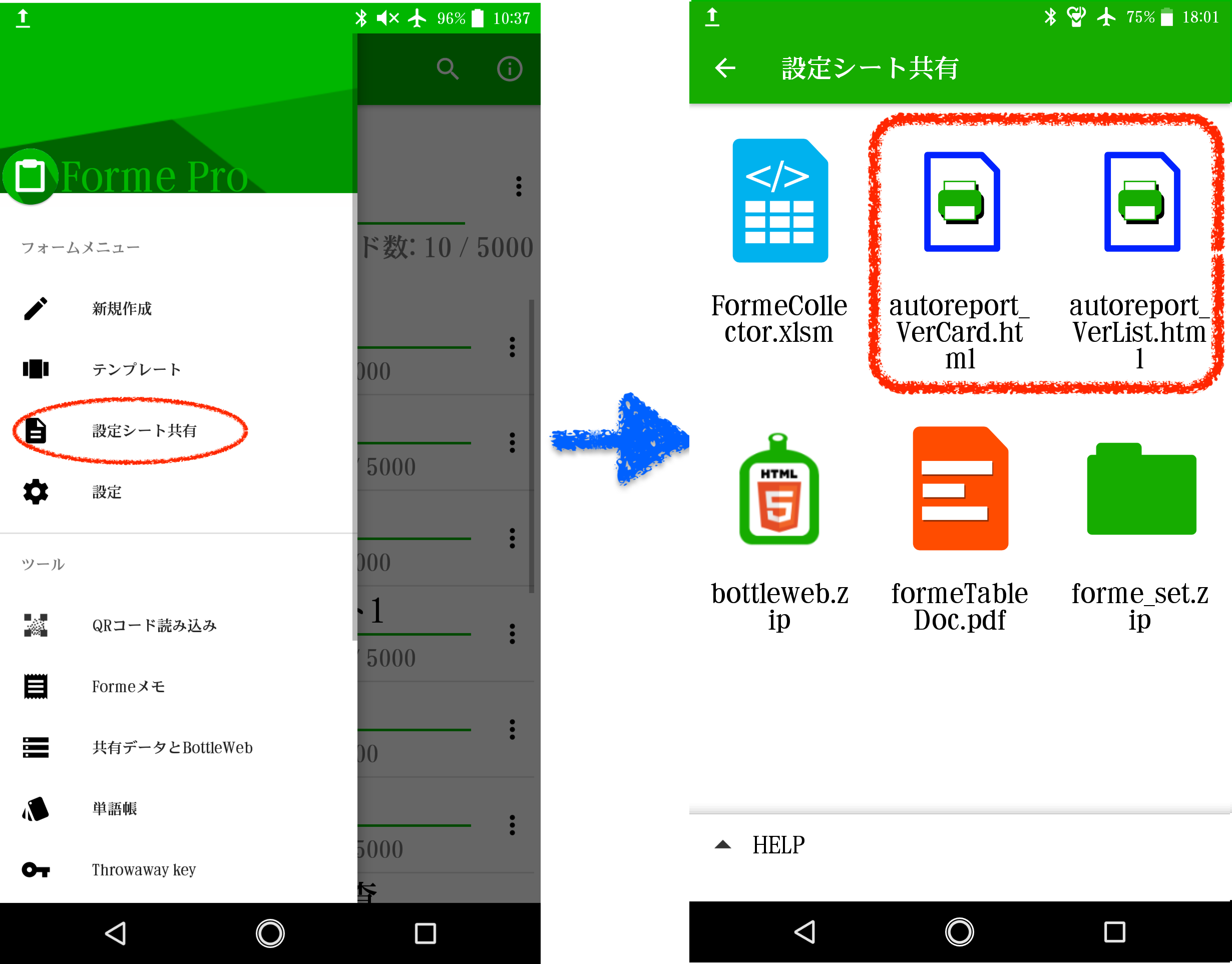 Androidアプリ Forme Pro(lite) Ver9.729から、フォームの印刷機能(AutoReport)が実装されました。 この機能は印刷用CSSを内包したHtmlファイルをテンプレートとし、フォームのレコードを任意の位置に転記して印刷する機能です。 メインメニューの設定シート共有のHtmlファイルをベースにテンプレートをコーディングすることが可能です。一部Javascriptが利用可能です。