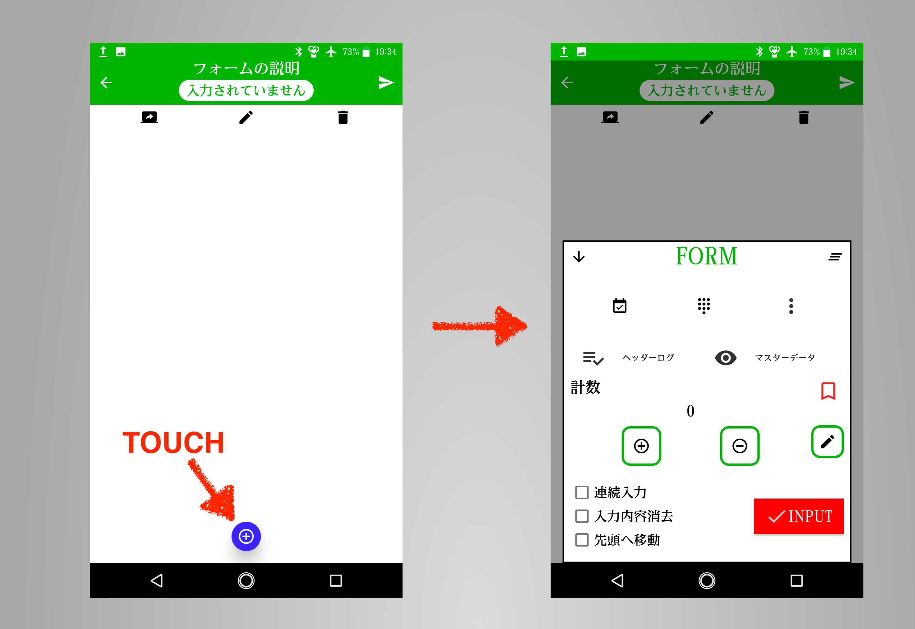 フォーム画面下の青いボタンで入力フォームが表示されます。初めてフォームを開いた場合も入力フォームが表示されています。