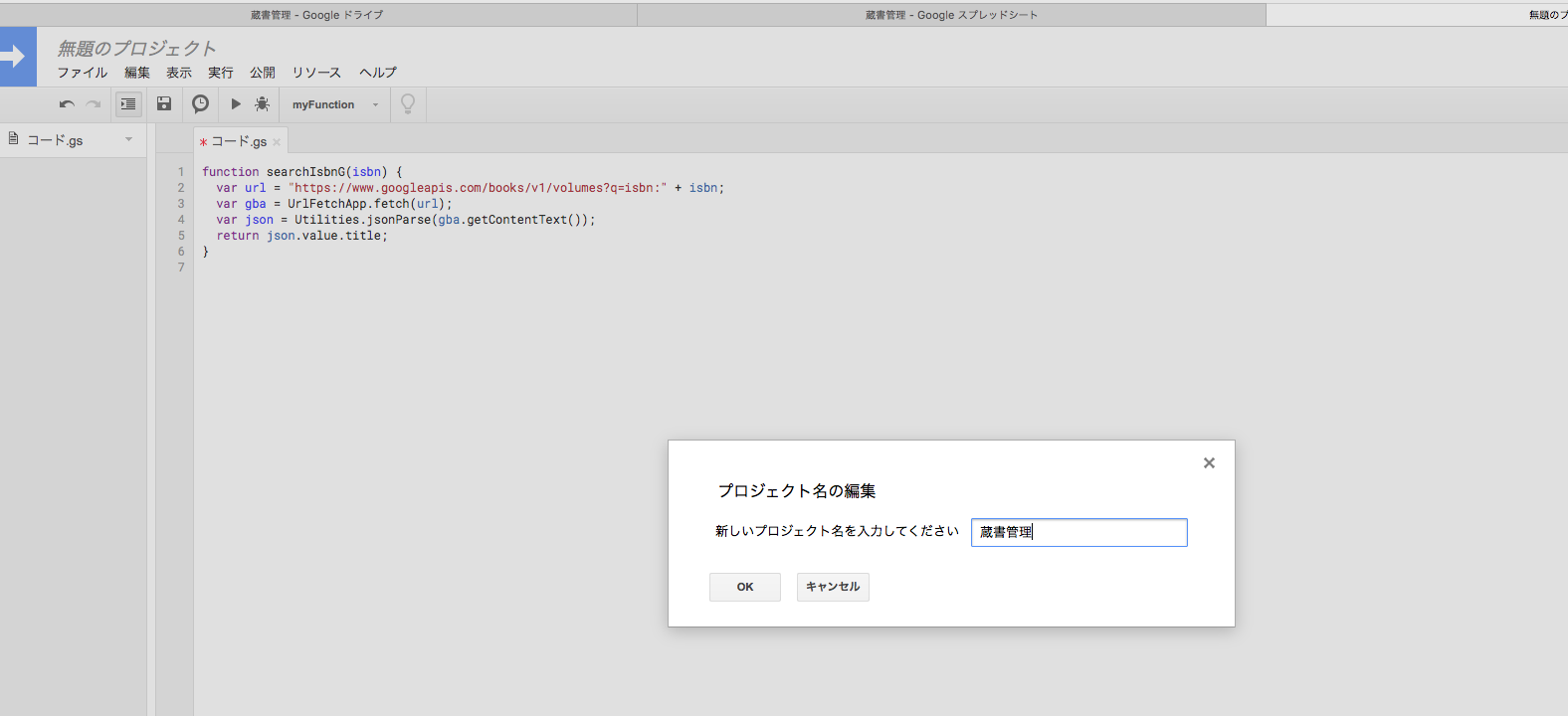 4.書籍名検索関数を作成する。スクリプトエディタ上で、ISBNから書籍名を取得する関数を作成します。 ここではswitch文で取得する情報を変えています。