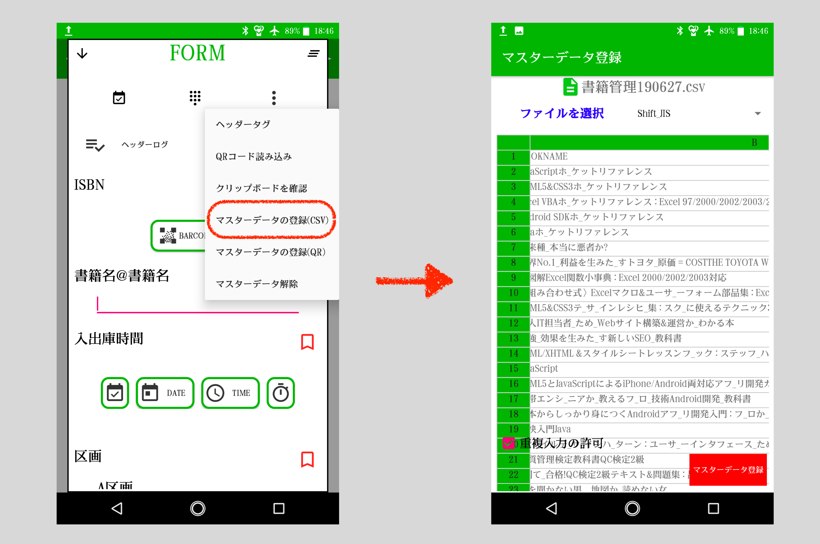 読み込みの際に重複入力の許可をオフにすると一度転記されたマスターデータは転記できなくなります。