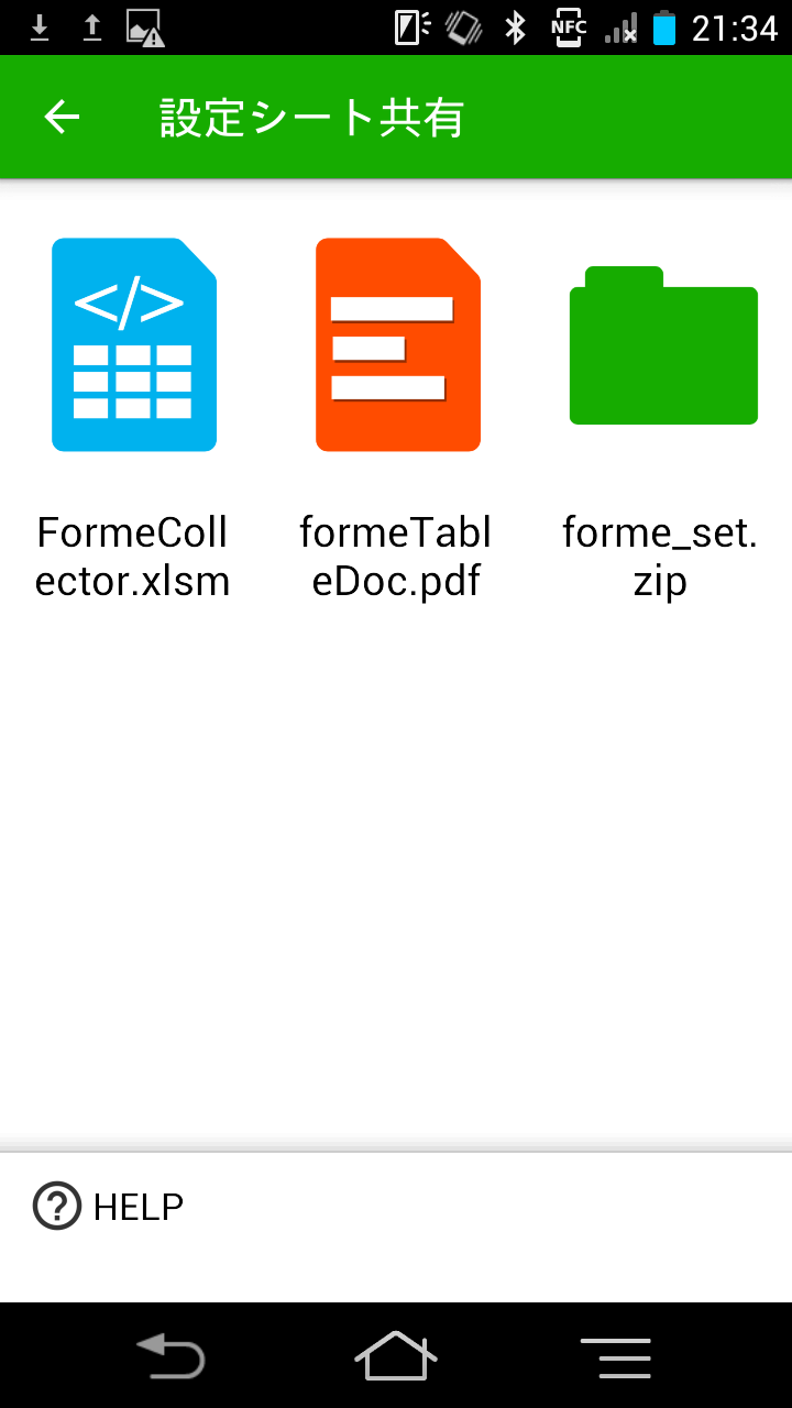 難しい現場も多いと思いますが、まず古く(OS4.1~)ても良いのでAndroid端末にForme Pro(試用であればForme lite)を インストールします。次に設定シート共有から、forme_set.zipを管理するパソコン(以下、管理用パソコン)へデータを送り解凍します。 (データの転送はBlueToothがおすすめです。Forme Folder(試験運用中)を使うとパソコンでアクセスできる領域に保存することができます。)