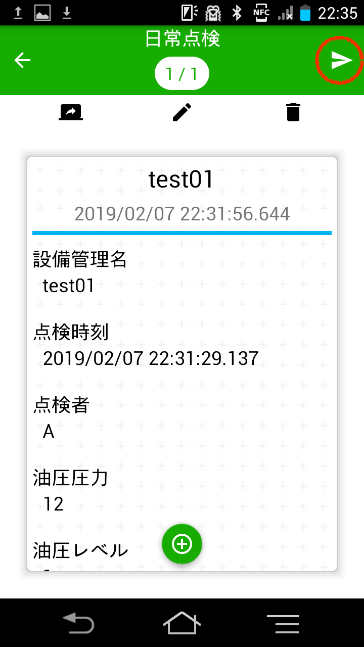 FormeCollector.xlsm設定のために、Androidアプリ Formeに作成したフォームに仮のデータを入力してください。 データ入力後、赤丸内の飛行機マークで共有画面に移動します。