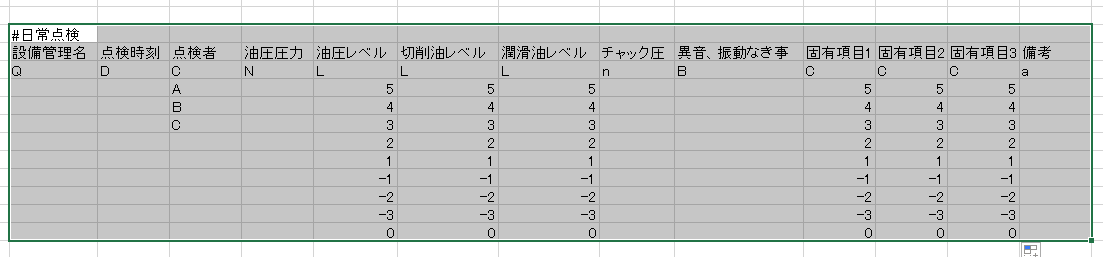フォームの設定では各機械油のレベルを5 ~ -3のリストとして登録しています。5 ~ 1をレベルの表記に使い、 -1 ~ -3は機械油を補充した際の記号と使用します。0は異常値として利用します。