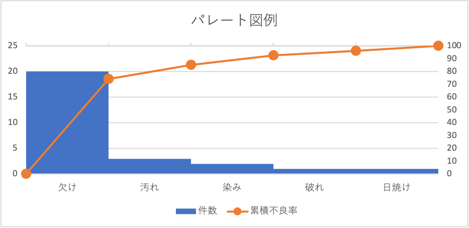 パーレート図は左軸に累積百分率、右軸に件数等の線形目盛を配置した線グラフと棒グラフの複合グラフのことを言います。このグラフはある製造現場の不良件数や客先からの苦情などを事象ごとに解析する場合に利用します。