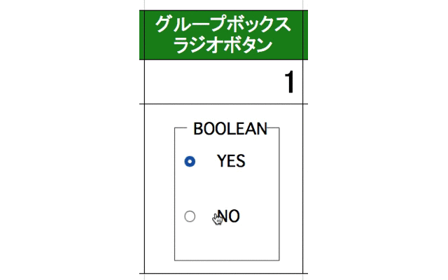 ラジオボタンは単体では意味を成しません。複数のラジオボタンが設置された状態でそのグループ内で選択されたラジオボタンの番号 (設置された順番)を参照先のセルに書き込みます。グループを指定する必要がある為にグループボックスとセットで使用する必要があります。 グループボックスを使用しない場合は、そのシート上での順番を返します。