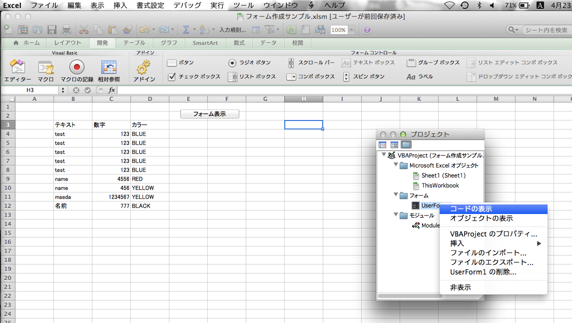 保存後に”エディター”を閉じて、”マクロ”を選択し、” formeCall “を起動。ユーザーフォームが表示されます。