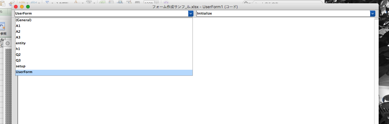 3.ファイル名 UserForm1(コード)ウィンドウ内で” Initialize “をを選択。(ユーザーフォームの初期化)