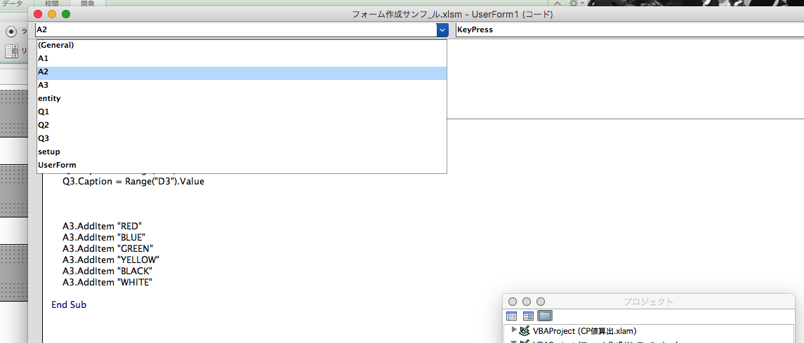 4.ファイル名 UserForm1(コード)ウィンドウ内で” A2 “をを選択。