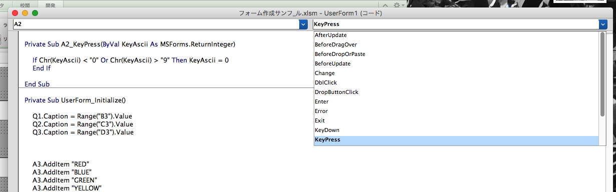 5.ファイル名 UserForm1(コード)ウィンドウ内で” KeyPress “をを選択。