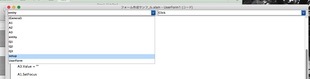 10.ファイル名 UserForm1(コード)ウィンドウ内で” setup “,” Click “をを選択。