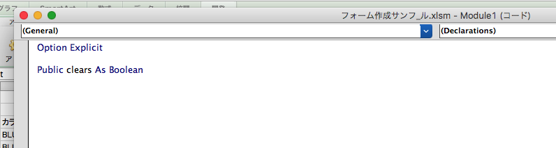12.作成された標準モジュール内に以下を記入する。グローバル関数 Clears を宣言する。(グローバル関数は標準モジュール内でしか宣言できない)